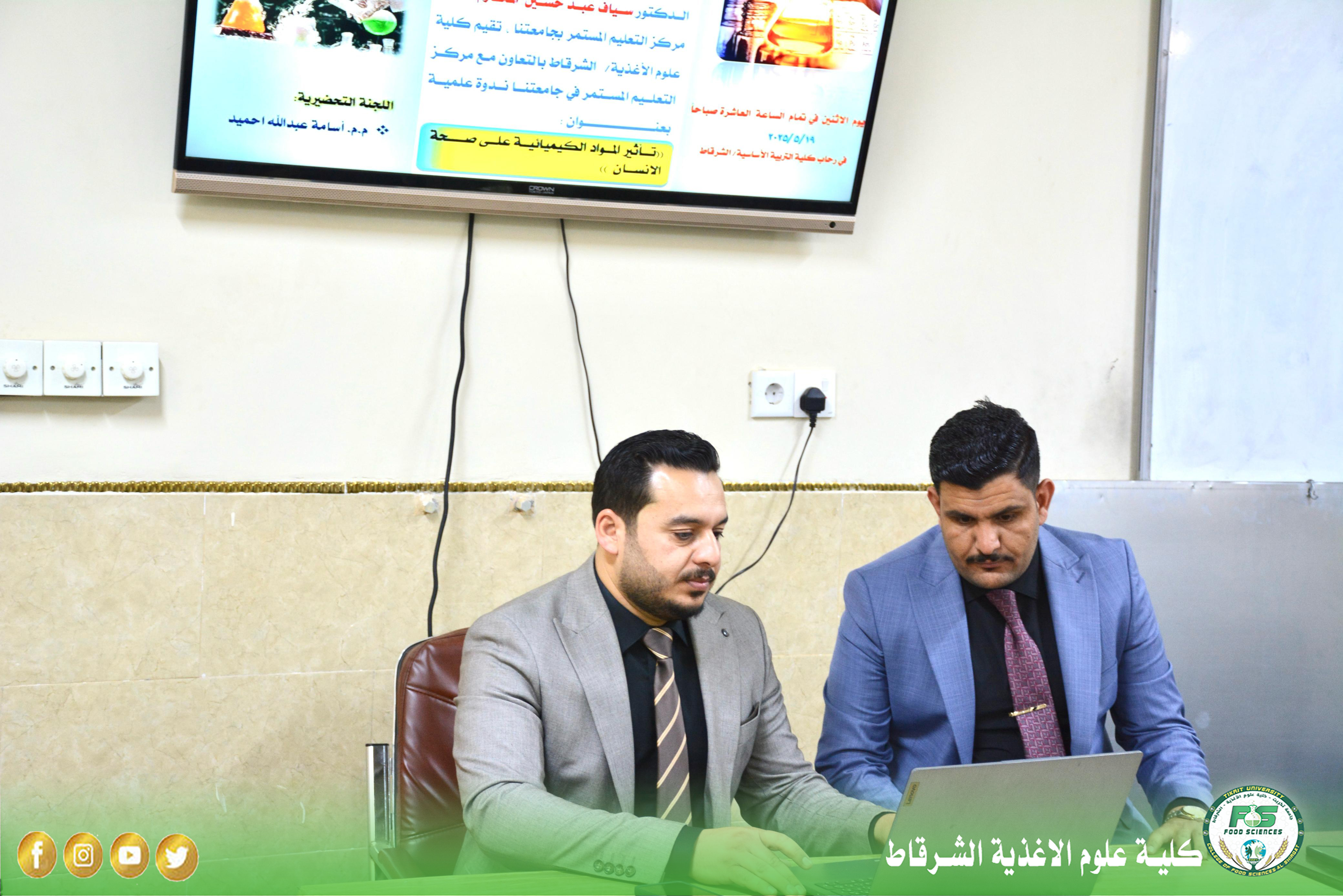 برعاية الأستاذ الدكتور وعد محمود رؤوف رئيس جامعة تكريت المحترم، وبإشراف المدرس الدكتور احمد حمد محمد عميد الكلية المحترم، والأستاذ المساعد الدكتور سياف عبد حسين مدير مركز التعليم المستمر, اقامت كلية علوم الاغذية الشرقاط بالتعاون مع مركز التعليم المستمر بجامعة تكريت ندوة علمية بعنوان “تأثير المواد الكيميائية على صحة الإنسان”، بمشاركة عدد من الباحثين وأعضاء الهيئة التدريسية وطلبة الكلية.
