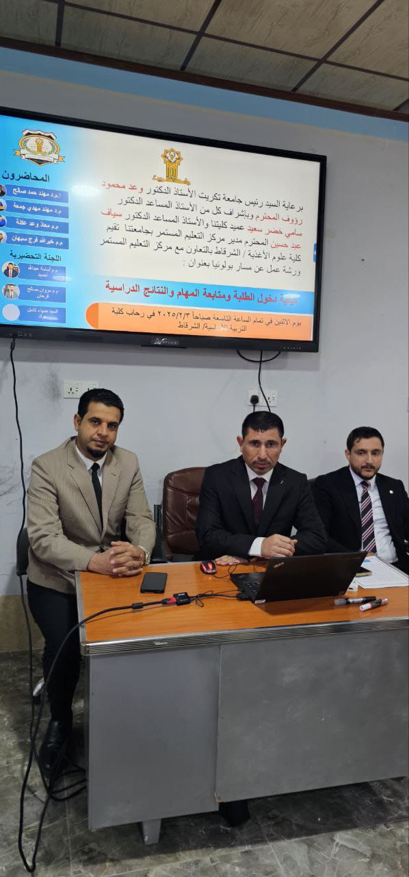 أقام قسمي علوم وتكنولوجيا الاغذية وعلوم وتكنولوجيا الألبان في كلية علوم الأغذية /الشرقاط وبالتعاون مع مركز التعليم المستمر ورشة عمل بعنوان "كيفية دخول الطلبة ومتابعة المهام والنتائج الدراسية ضمن مسار بولونيا"، وذلك في يوم الاثنين الموافق [٢٠٢٥/٢/٣]، بمشاركة عدد من الطلبة وأعضاء الهيئات التدريسية.