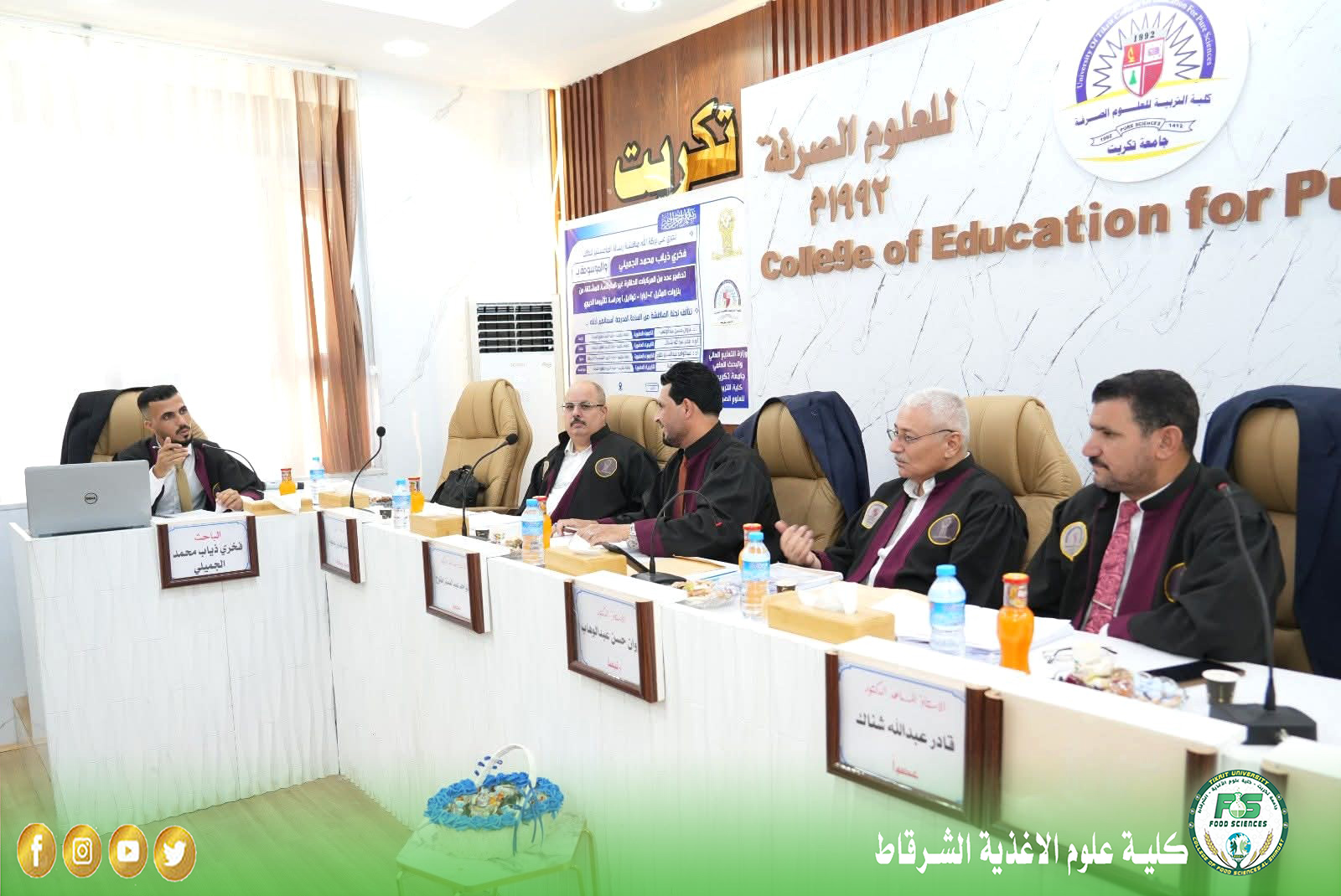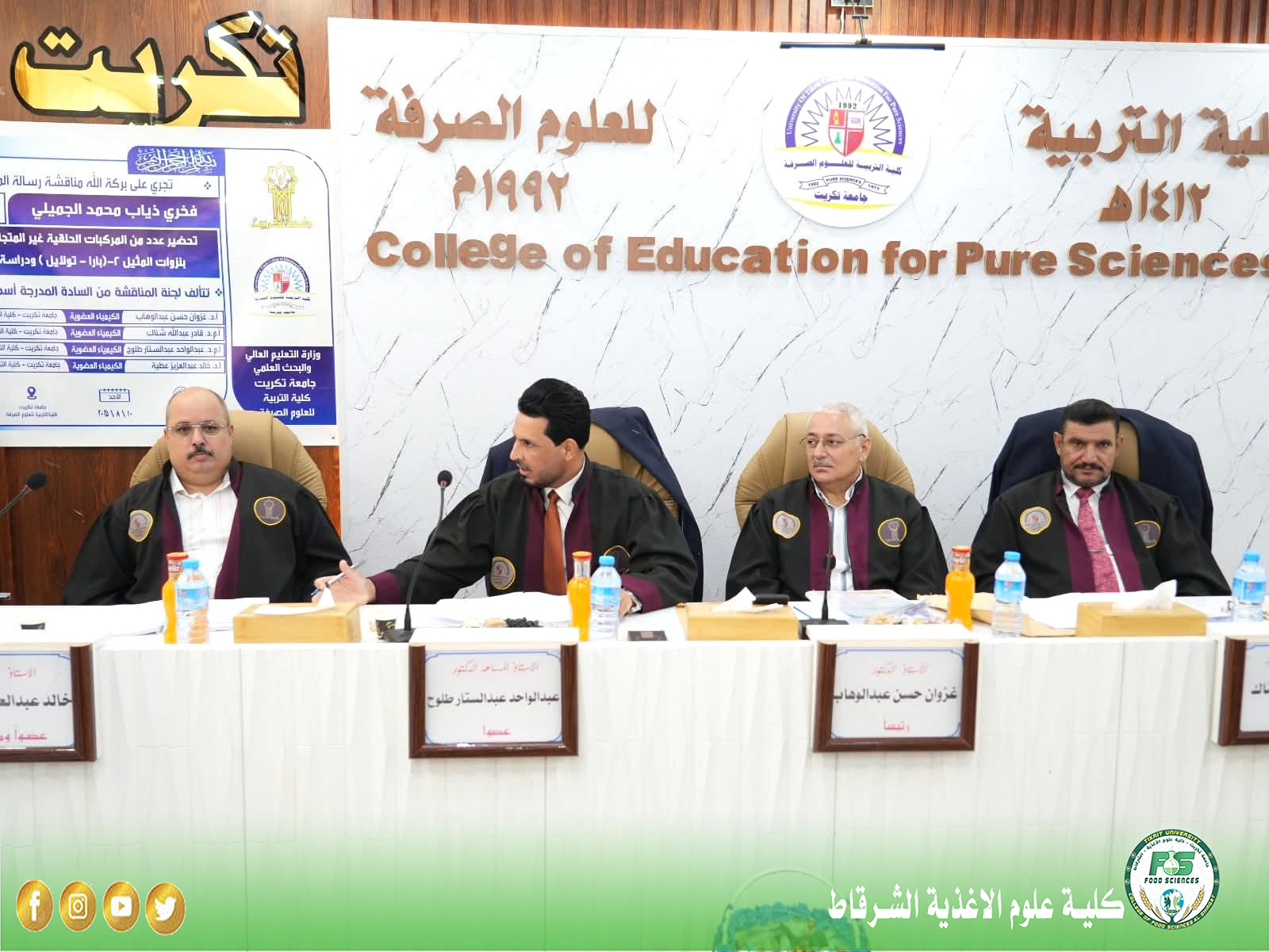 شارك الأستاذ المساعد الدكتور عبدالواحد عبدالستار طلوح، معاون العميد للشؤون العلمية في كلية علوم الأغذية – الشرقاط / جامعة تكريت، في عضوية لجنة مناقشة رسالة ماجستير للطالب فخري ذياب محمد في قسم الكيمياء بكلية التربية للعلوم الصرفة – جامعة تكريت، والموسومة: "تحضير عدد من المركبات الحلقية غير المتجانسة المشتقة من بنزوات المثيل 2-(بارا-تولايل) ودراسة تأثيرها الحيوي".