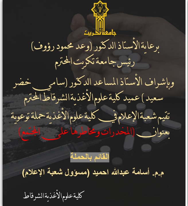 برعاية الاستاذ الدكتور وعد محمود رؤوف رئيس جامعة تكريت المحترم ، وبإشراف الاستاذ المساعد الدكتور سامي خضر سعيد عميد كلية علوم الاغذية/ الشرقاط المحترم نظّمت شعبة الإعلام والاتصال الحكومي في كلية علوم الأغذية حملة توعوية بعنوان "ظاهرة تعاطي المخدرات وتأثيرها على المجتمع"، بهدف تسليط الضوء على المخاطر الجسيمة لهذه الظاهرة وسبل الوقاية منها.